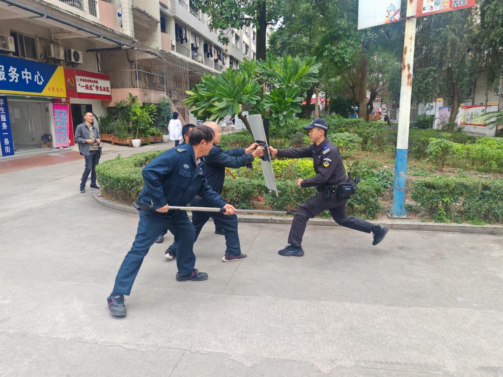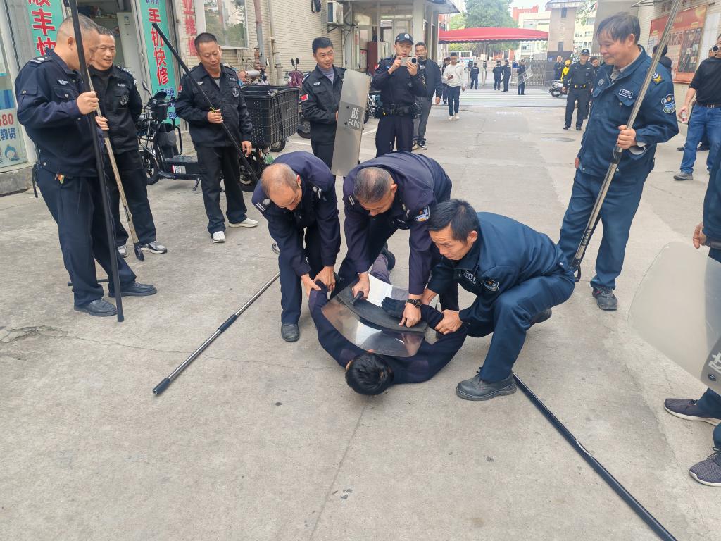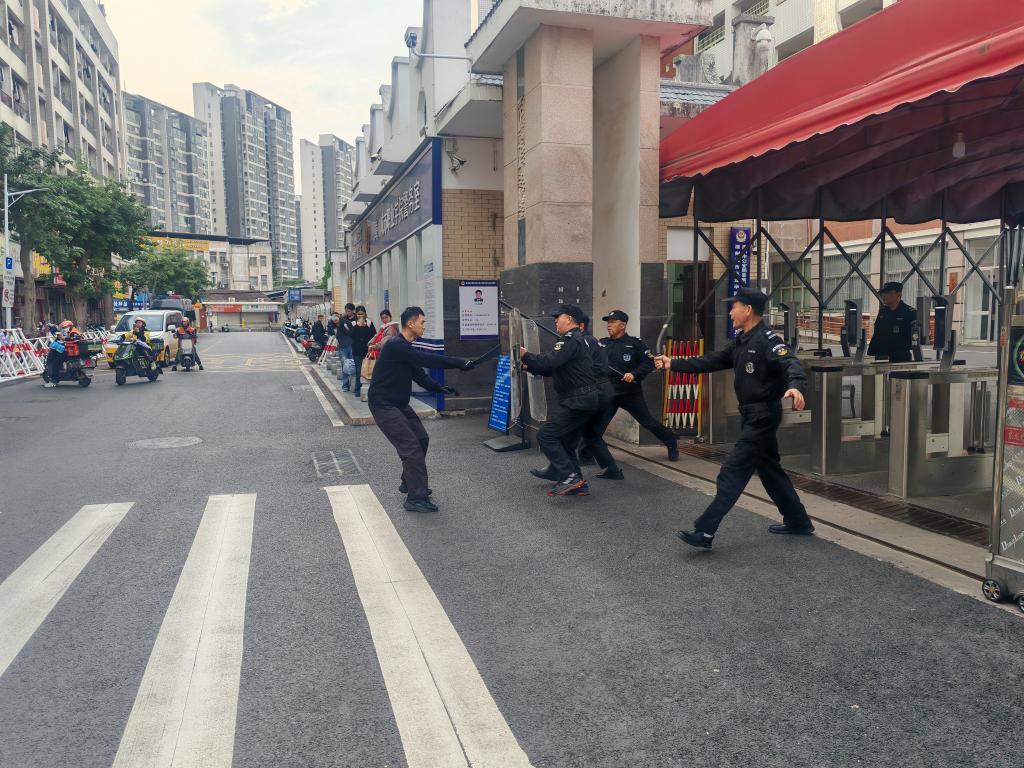 本次演练模拟“暴恐分子”企图强行闯入学生公寓的突发场景。一名“暴恐分子”手持器械,试图冲击学校南门,保安人员迅速反应,启动一键报警装置并使用防暴盾牌、钢叉组成防御队形,成功拦截。“暴恐分子”见南门受阻,立即转向通鑫学生公寓,企图强行闯入。公寓保安人员同步启动应急预案,使用防暴器械对“暴恐分子”实施围控。在保安人员的密切配合和协同作战下,“暴恐分子”被成功制服,整个演练紧张有序、处置高效。