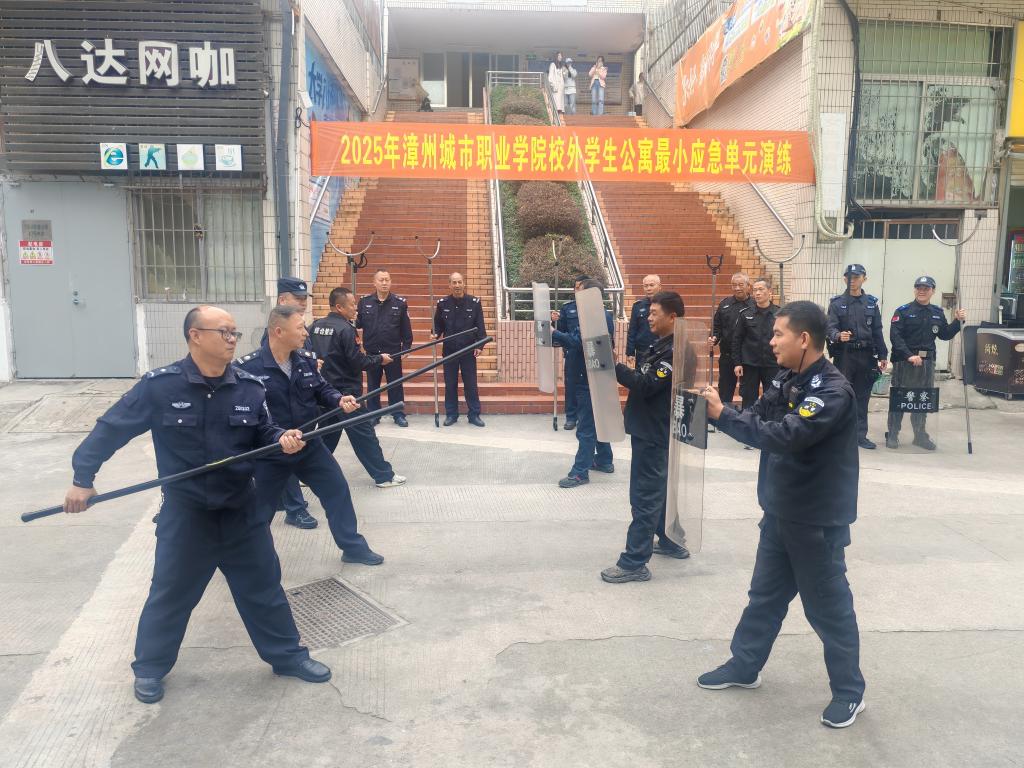为进一步提升校外学生公寓安全防范和应急处置能力,贯彻落实省、市教育主管部门关于校园周边安全工作的部署要求,切实保障校园周边安全稳定,2025年12月31日下午,漳州城市职业学院联合芗城公安分局巡特警反恐大队、县前派出所、金盾集团通鑫项目部、通鑫和西洋学生公寓物业服务公司开展最小应急单元演练。